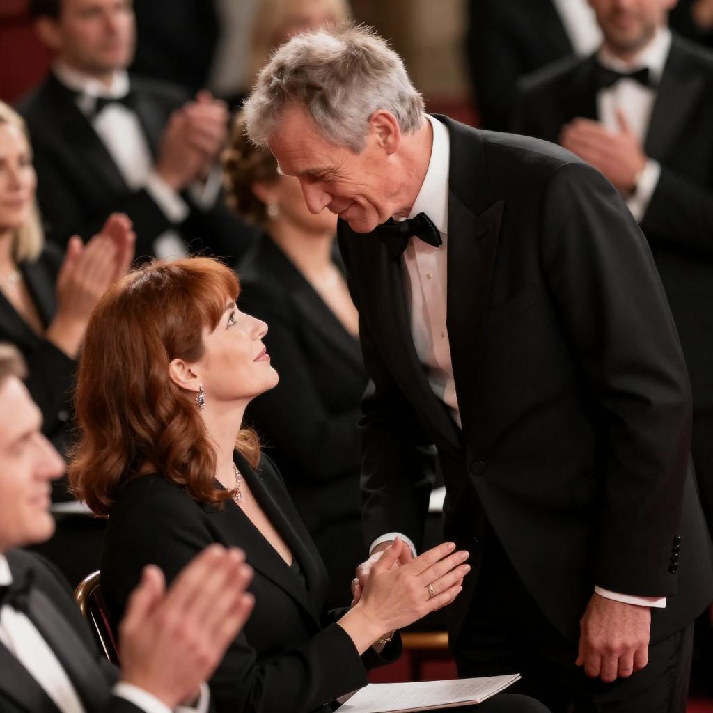 Photograph of a formal event. A middle-aged man with gray hair in a black tuxedo leans down, looking at a woman with red hair and earrings. She looks up at him with a slight smile. Background: other people in black tuxedos, clapping. Warm lighting. The man and woman are in the center, foreground.