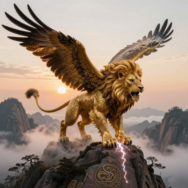 Mythical eagle lion hybrid soaring majestically over mountain peaks at sunrise, intricate feathers blending with golden lion fur, powerful talons gripping a thunderbolt, surrounded by swirling mist and ancient runes, cinematic lighting enhancing the majestic aura.