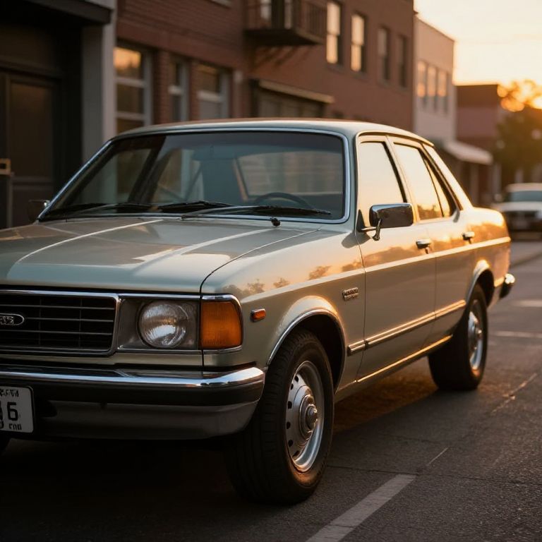 1990 Ford Fusion parked on a vintage city street at sunset, golden light reflecting off its classic chrome details, retro urban background, cinematic atmosphere, realistic style