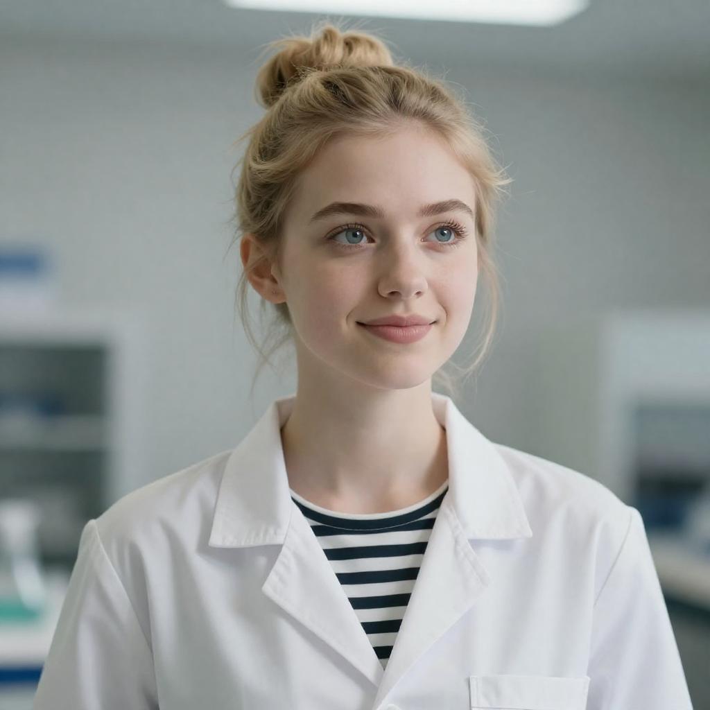 Photograph of a young woman with light blonde hair in a loose bun, wearing a white lab coat over a black and white striped shirt. She has fair skin, blue eyes, and a slight smile, looking slightly upward. The background is blurred, focusing attention on her face.