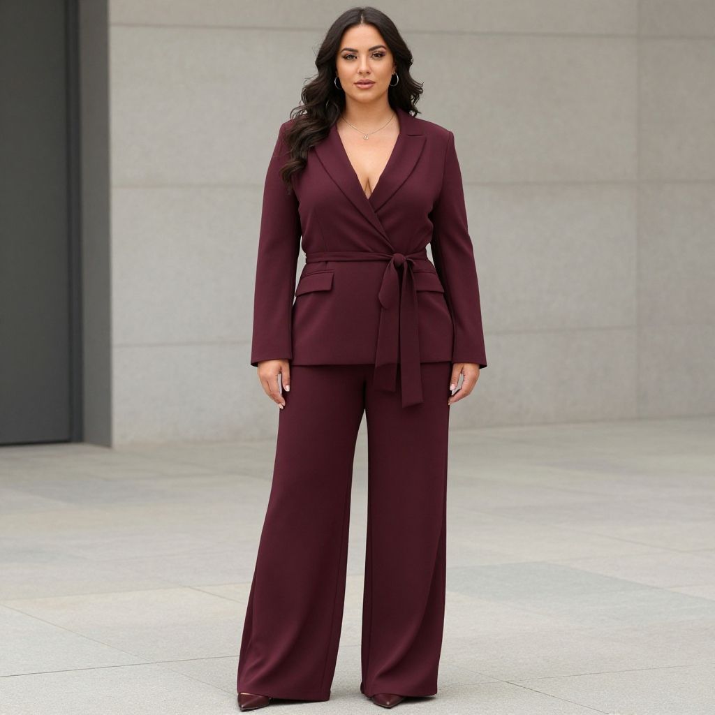 Burgundy pants suit women's plus size, chic and stylish with a cinched waist blazer and flowing trousers, set against a minimalist urban backdrop with soft natural light, showcasing texture and color depth, contemporary fashion editorial vibe