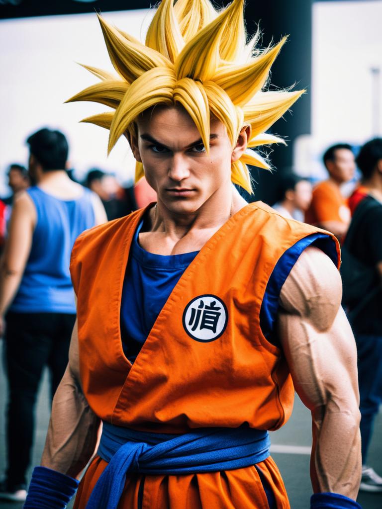 Man in Goku Super Saiyan Costume, cosplay festival portrait, photorealistic realism