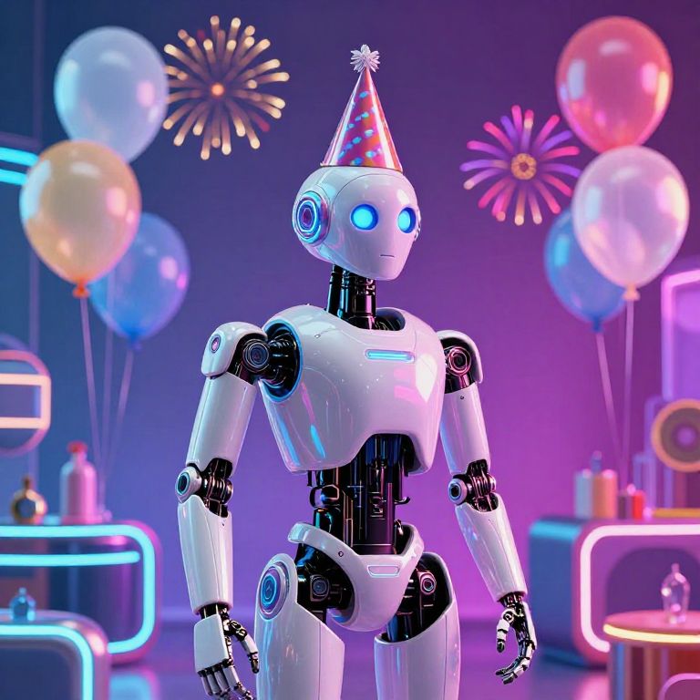 An advanced humanoid robot wearing a colorful party hat stands in a vibrant celebration scene. The background features holographic balloons, digital fireworks, and sleek metallic furniture with glowing LED accents, creating a festive, futuristic atmosphere combining technology and party elements.