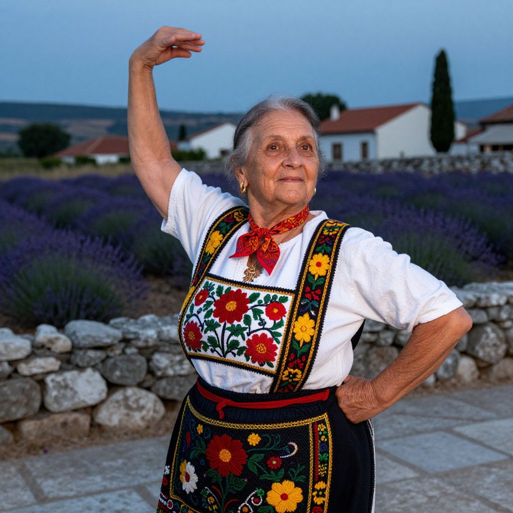 Photograph of an elderly woman with light skin and short, gray hair, standing outdoors during twilight. She wears a white blouse with a black, embroidered apron featuring colorful floral patterns and a red flower at the center. Her right arm is raised, and her left hand rests on her hip. The background shows a stone wall, lavender bushes, and distant white buildings with red roofs. The sky is a gradient of blue, suggesting early evening. The woman's expression is confident and serene. The texture of the stone wall and the embroidered apron are distinct.