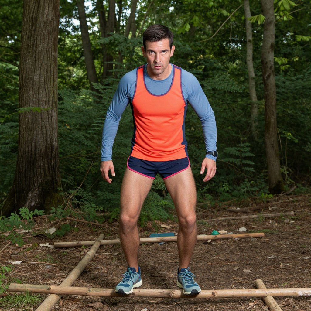 A man, athletic-fit tank top, quick-dry swim trunks, lightweight trail runners, UV-protective long-sleeve shirt, vibrant colors with dark accents, lush forest clearing, makeshift obstacle course, hand-tinted photograph, focused expression Man has masculine face and piercing eyes
