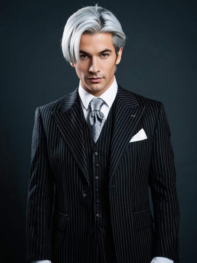 Photo-realistic cosplay photo of person in antonio salieri (second ascension) (fate) costume. 1boy, red eyes, hair between eyes, grey hair, white hair, short hair, pinstripe suit, suit, black gloves, pinstripe suit, suit, black jacket, long sleeves, formal, half updo, formal, red ascot. full body shot