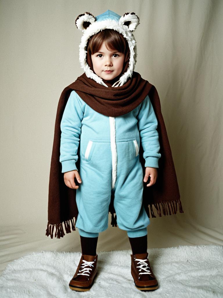 Newborn costume, solo, realistic, hood, blue eyes, 1girl, barefoot, looking at viewer, brown hair, photorealistic, animal hood, child