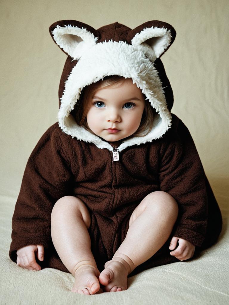 Photorealistic image of a baby girl with blue eyes and brown hair sitting barefoot. She is wearing a brown fleece hooded costume with white fluffy lining and animal ears on the hood, looking directly at the viewer against a neutral beige background.