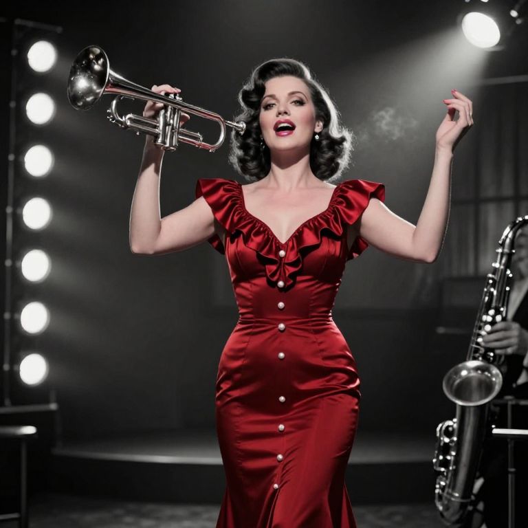A sultry 1930s jazz singer with large, expressive eyes and a smoky pink lip gloss, wearing a long, form-fitting gown of deep red with satin ruffles and pearl buttons, standing confidently on a vintage stage with a black-and-white background, the lights shining from the edges like a noir film, her arms raised slightly as she belts out a song, the air filled with the hum of a trumpet and a faint echo of a saxophone, rich atmosphere with cinematic lighting