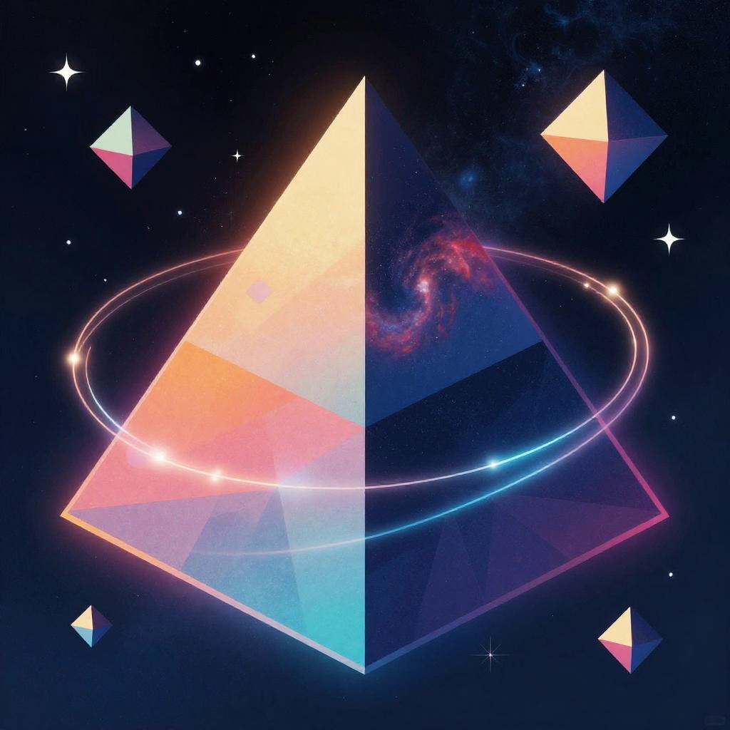 Abstract pyramid concept art blending geometric shapes and surreal elements, layered pyramids floating in a cosmic scene with glowing energy lines, stars, and nebulae, vibrant contrasting colors, futuristic and mystical ambiance, highly stylized and imaginative.