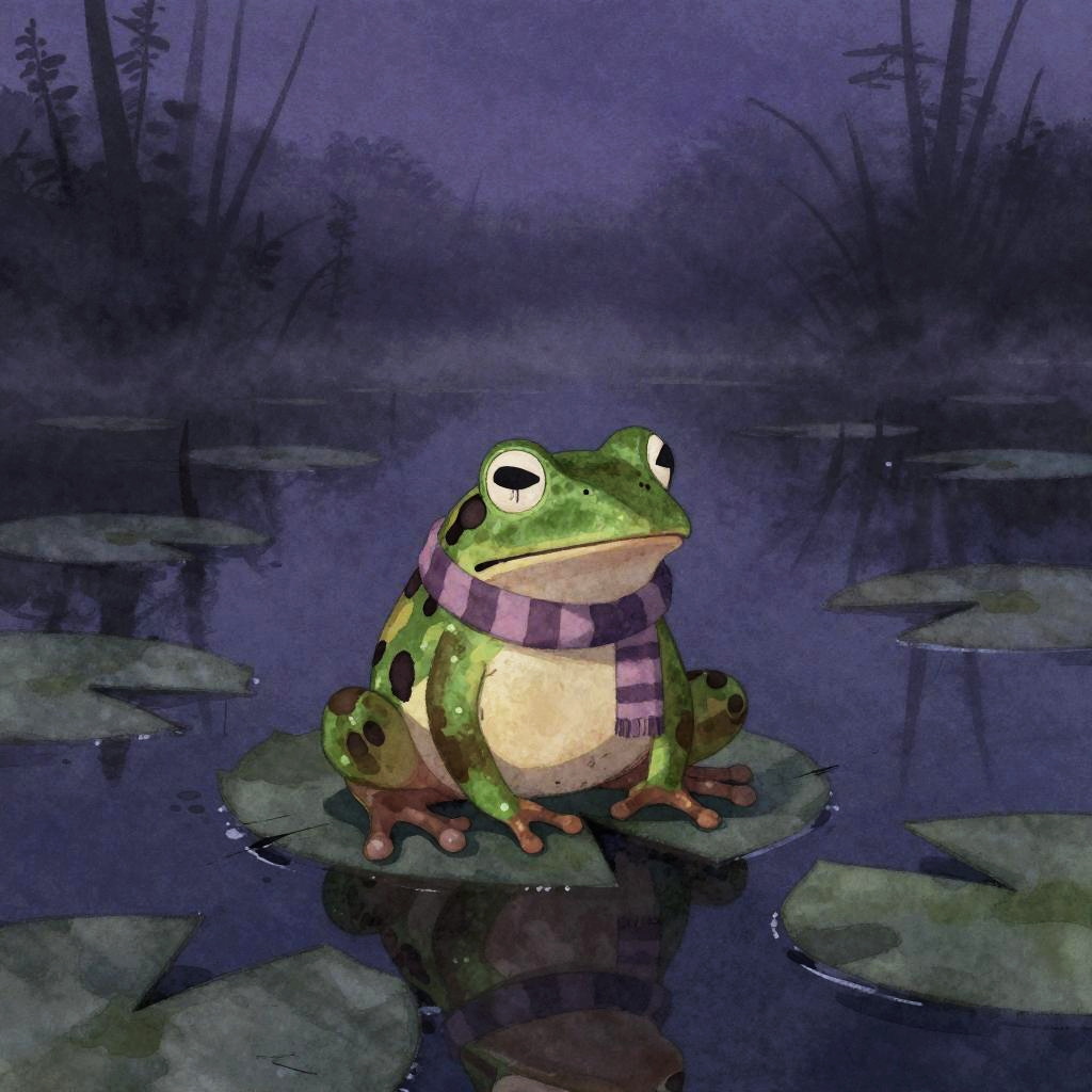 Emo frog sitting alone on a cracked lily pad in a foggy swamp at twilight, with deep purple and black hues, wearing a tiny striped scarf and a melancholic expression, painted in a stylized, atmospheric watercolor style with subtle reflections.