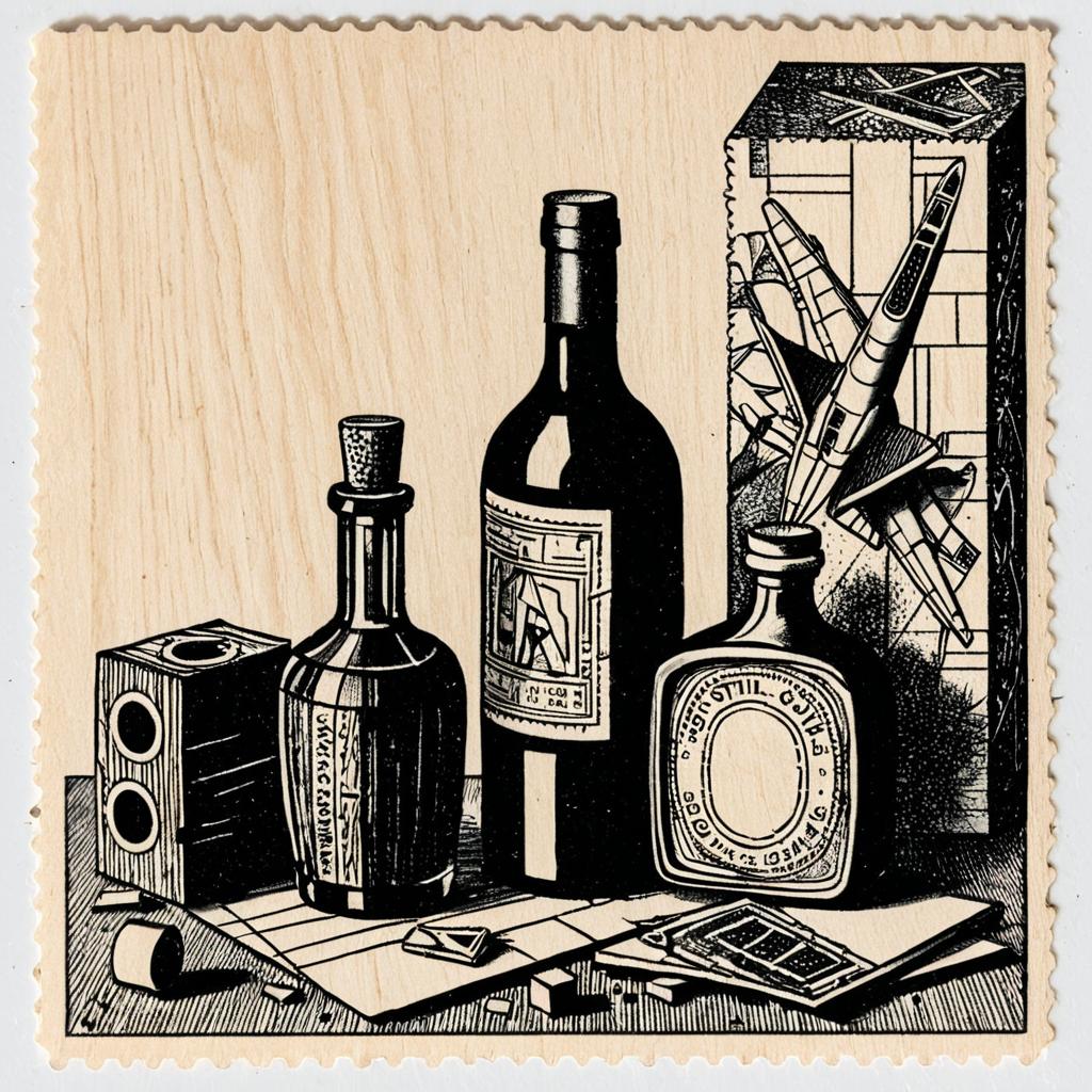 Cubism rubber stamp, with an image of still life with bottle and fragmented planes.