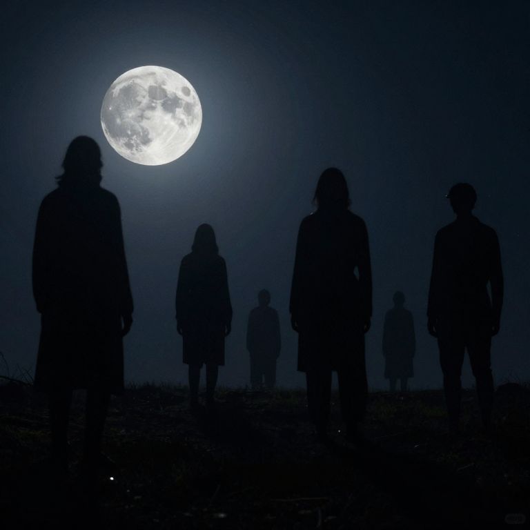 Photograph of a dark, misty night scene featuring the silhouettes of seven people standing in a row. A large, bright full moon dominates the top left, casting a blue glow over the scene. The figures, of varying heights and genders, are indistinct due to the shadows, but their outlines suggest casual clothing. The ground is barely visible, covered in darkness. The mist adds a mysterious, eerie atmosphere, with the moon's light diffused through the fog. The overall color palette is deep blue and black, emphasizing the nighttime setting.