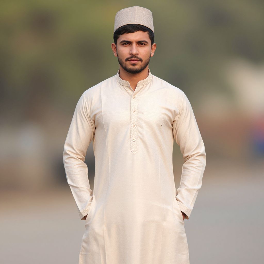 Photograph of a young South Asian man with a trimmed beard, wearing a white traditional long kurta and a gray cap, standing with hands in pockets