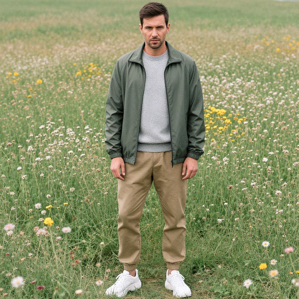 Photograph of a man standing in a wildflower field, wearing a green jacket, white tee, beige pants, and white sneakers.