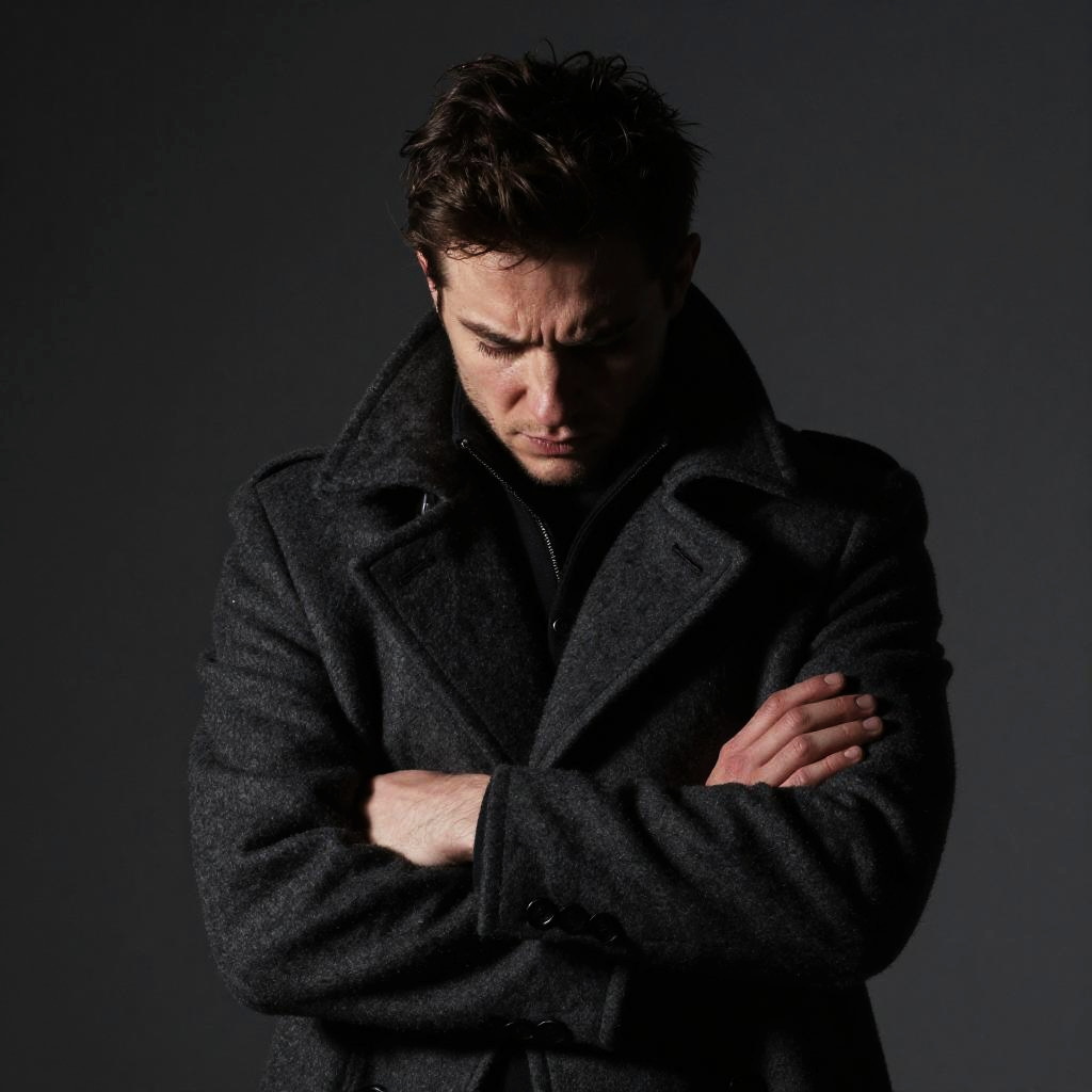 Expressive portrait of a brooding man in a head down, arms crossed, wearing heavy wool coat, with dramatic lighting and soft shadows, created in a dramatic chiaroscuro