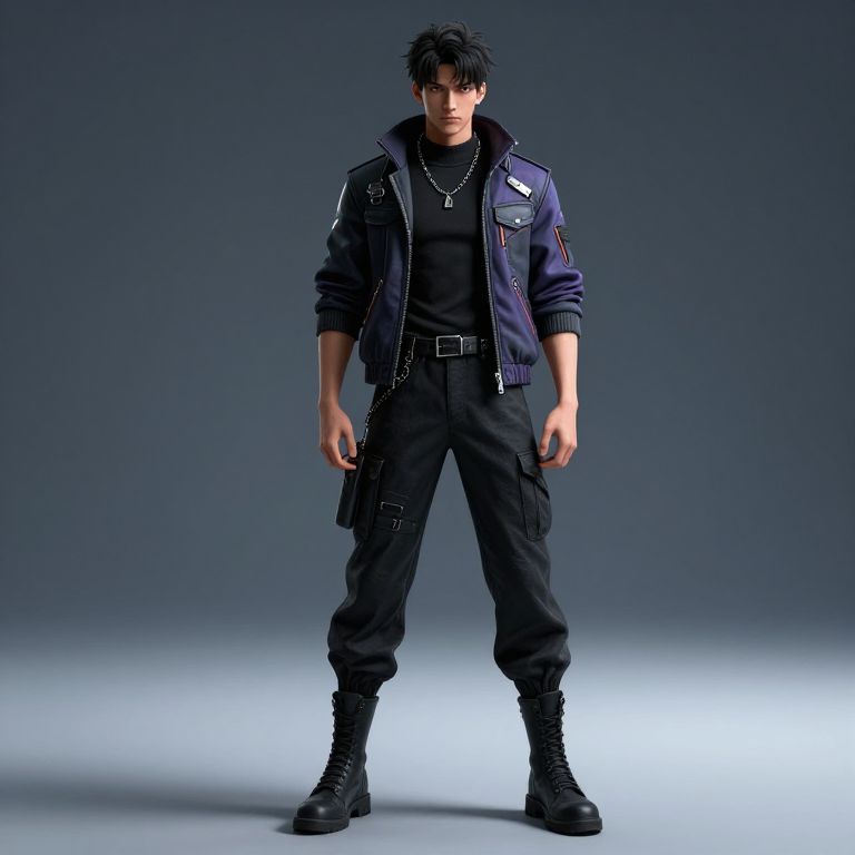 Promotion male cyberpunk character, high fashion, futuristic, full body, 3d rendering, cinematic, high resolution,