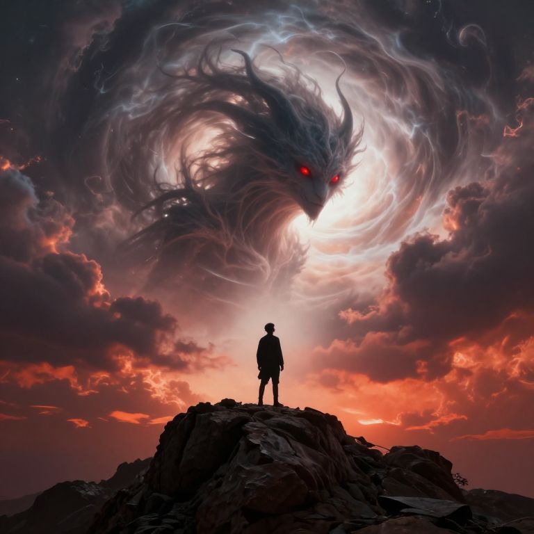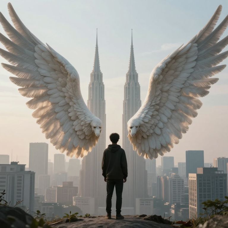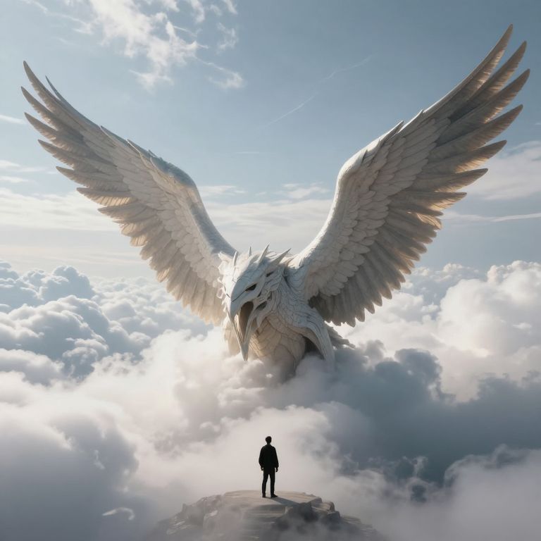 Digital artwork: Silhouetted figure stands on cloudy mountain peak, gazing at massive, majestic white-winged bird with outstretched wings in