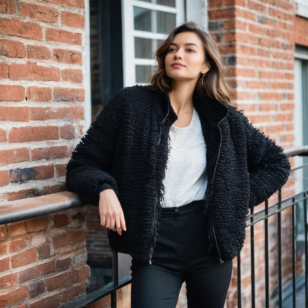 A stylish young woman wearing a black fluffy jacket and black pants, posing casually on an outdoor balcony with brick wall in the background, natural light highlighting her relaxed pose and soft facial expression, urban setting, casual chic fashion style