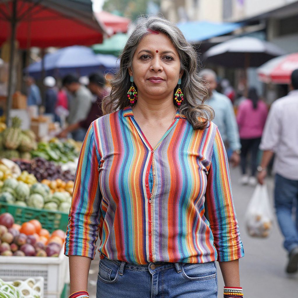 A confident middle-aged woman with wavy graying hair wearing a colorful striped blouse and blue jeans stands in an outdoor market. She has a red bindi on her forehead and wears vibrant earrings and bracelets. The market is busy with people and colorful awnings and fresh produce visible in the background.