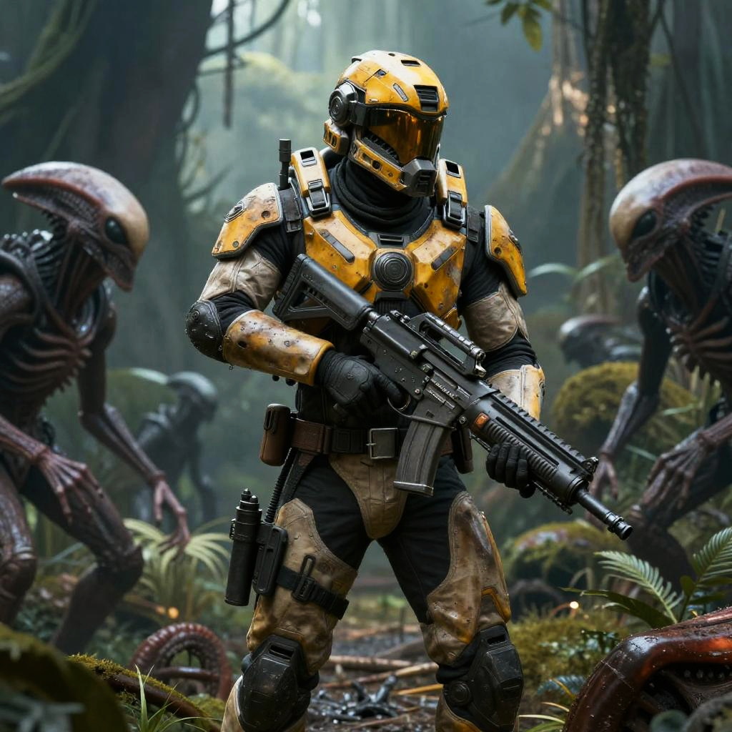 Helldivers 2 warrior holding a heavy blaster rifle, surrounded by alien creatures in a dense alien jungle, futuristic military gear with battle damage, moody lighting, cinematic composition