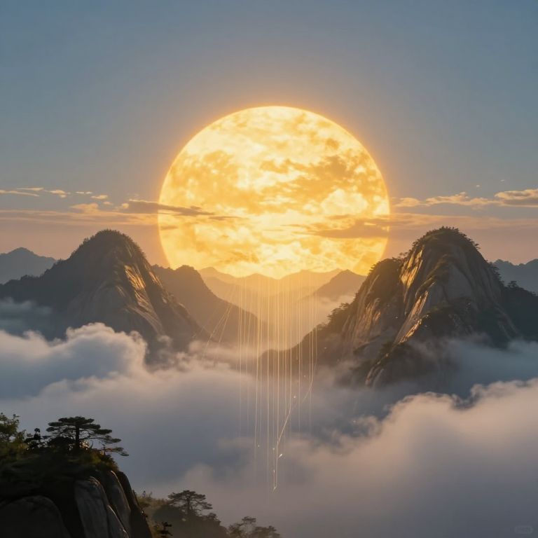 Suspended between heaven and earth, inverted mountains cradle the sun’s golden embrace, their ethereal forms tethered by luminous threads, evoking a surreal dance of gravity and dreams.