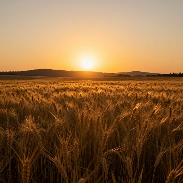 Sunset bathes a golden wheat field in warm hues as the sun descends behind distant hills, casting long shadows and silhouettes of tall stalks against the gradient sky.