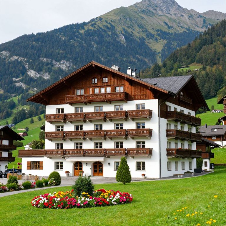 Grand Hotel Zell Am See stands majestically against a backdrop of lush green mountains, featuring a multi-story building with white walls, brown wooden balconies, and a dark roof, surrounded by well-manicured lawns and vibrant flowerbeds, inviting travelers on scenic Austrian road trips.