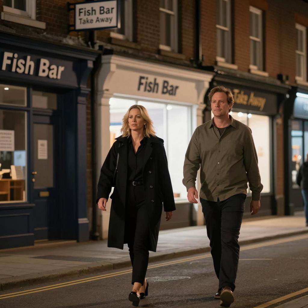 Nighttime photograph of two people walking on a street. A woman with blonde hair, black coat, and black pants walks on the left, a man with brown hair, green shirt, and dark pants walks on the right. Brick building with "Fish Bar" sign on the left, illuminated storefronts in the background. Both have neutral facial expressions. Street sign reads "Fish Bar Take Away."