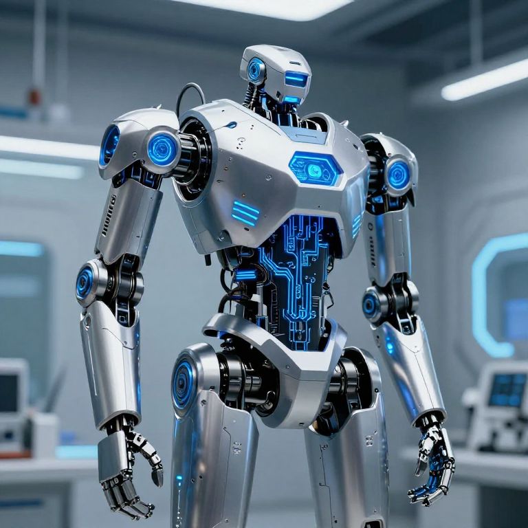 As3336, an advanced robotic prototype standing in a high-tech laboratory, metallic surfaces with glowing blue circuits, intricate design with mechanical joints and futuristic background, realistic style