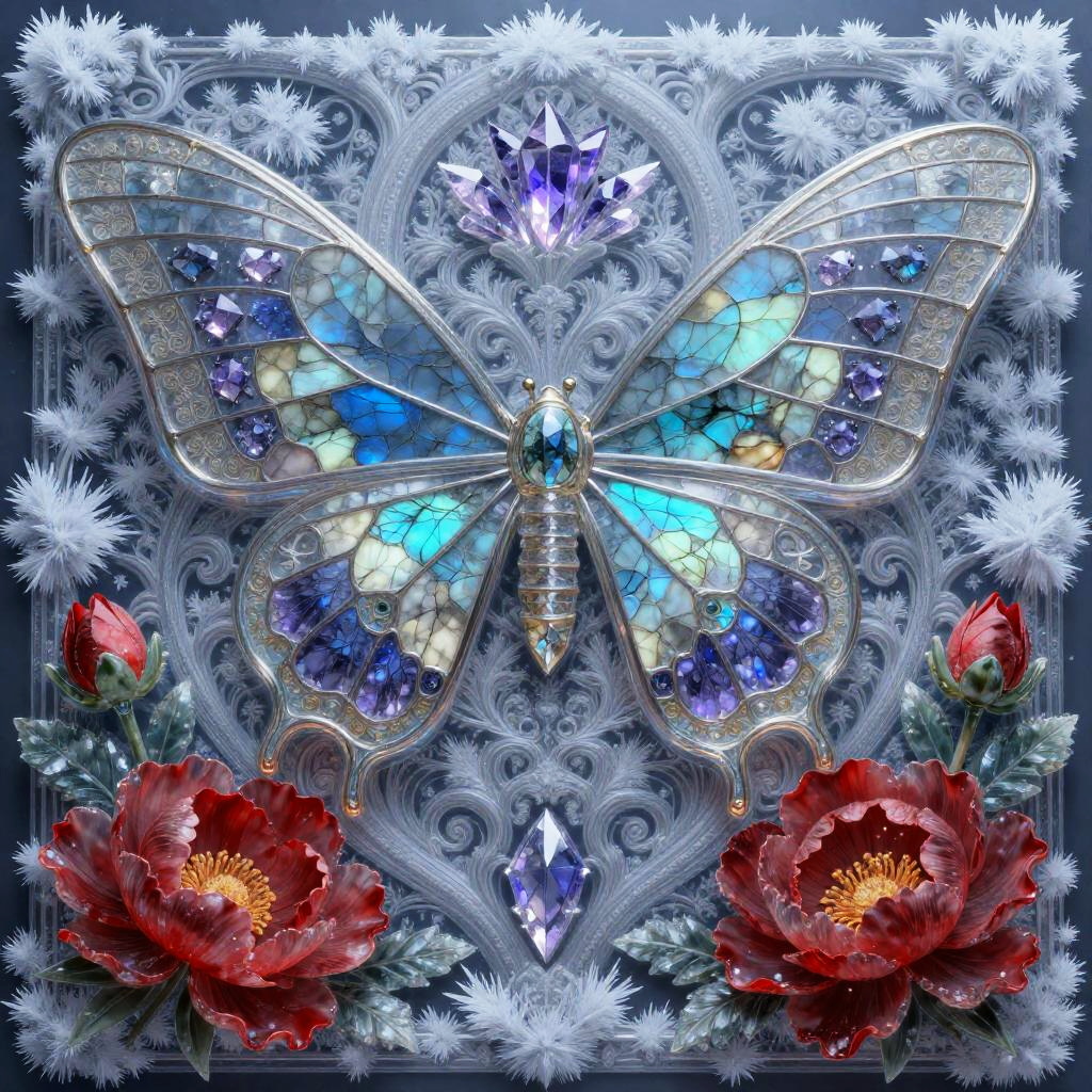A rococo steampunk butterfly automaton crafted from enamel, brushed copper, hand-cut crystals, and violet silk threads, designed by Gustav Klimt and Takashi Murakami, with intricate linework, hyper-detailed textures, vibrant colors, super sharp focus, high contrast, and a matte finish.