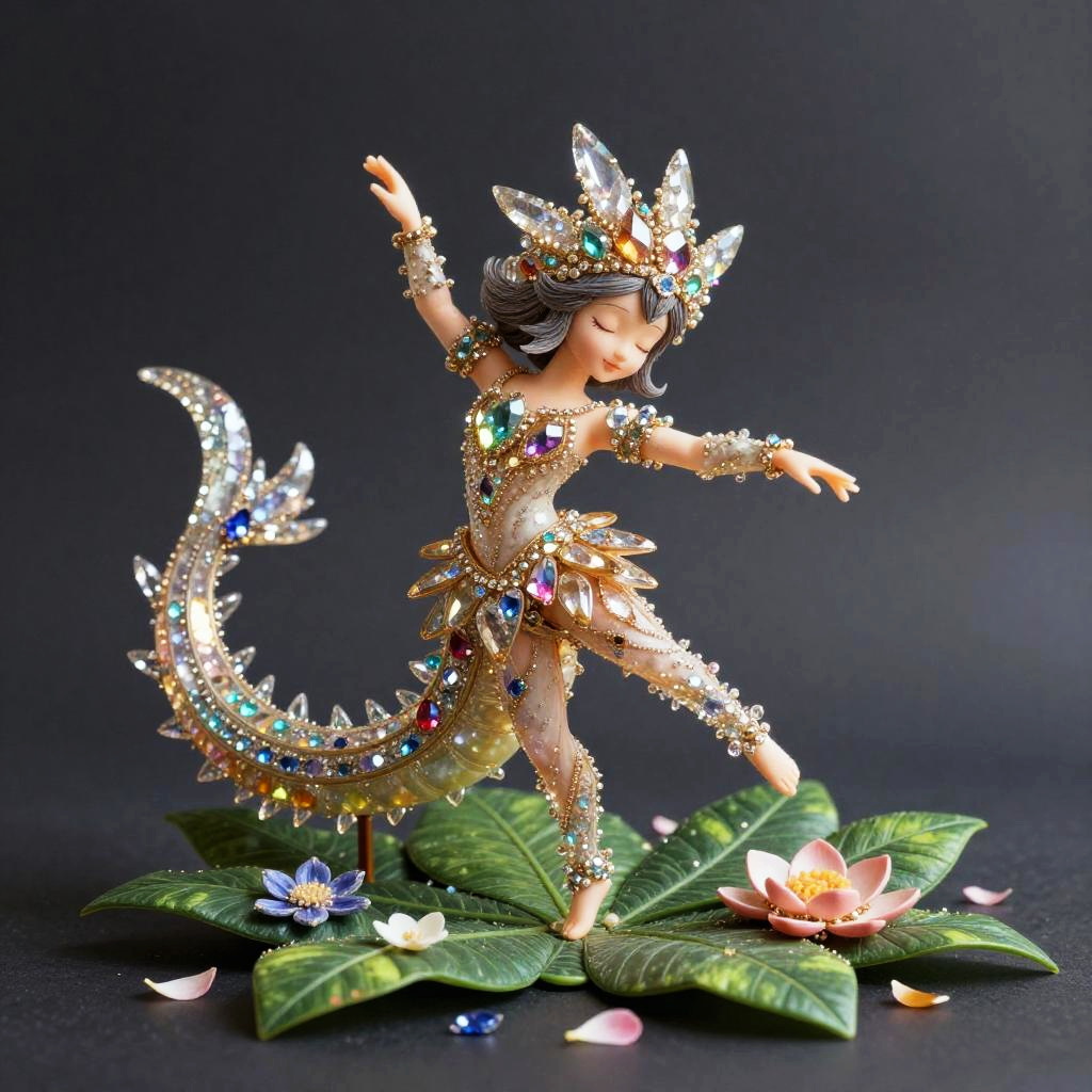 A hyperrealistic figurine of a fairy adorned with colorful crystals and jewels, dancing gracefully on green leaves decorated with delicate flower petals. The fairy wears an ornate crystal crown and a sparkling costume with intricate gem details, set against a dark background for contrast.