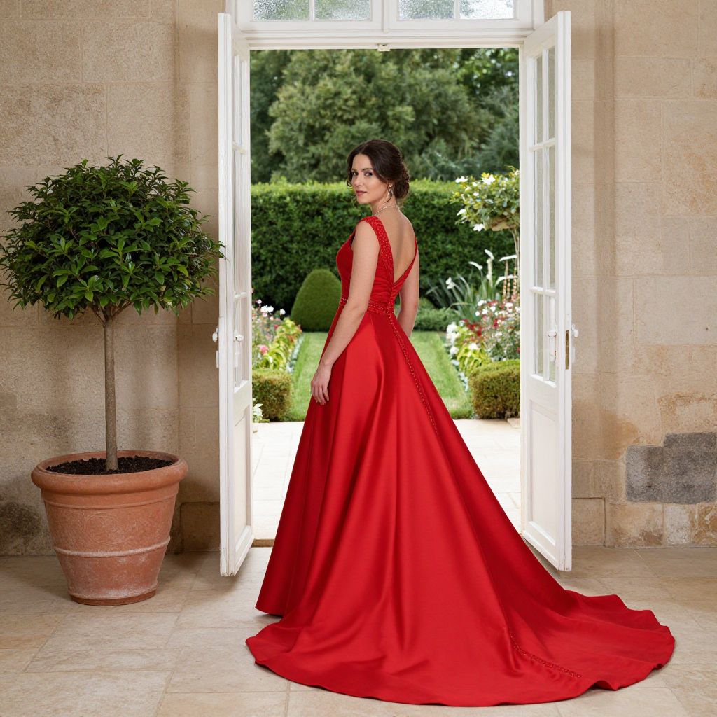 Photograph of a dark-haired woman in a backless, vibrant red ball gown, standing in an open doorway, garden visible outside. Potted plant