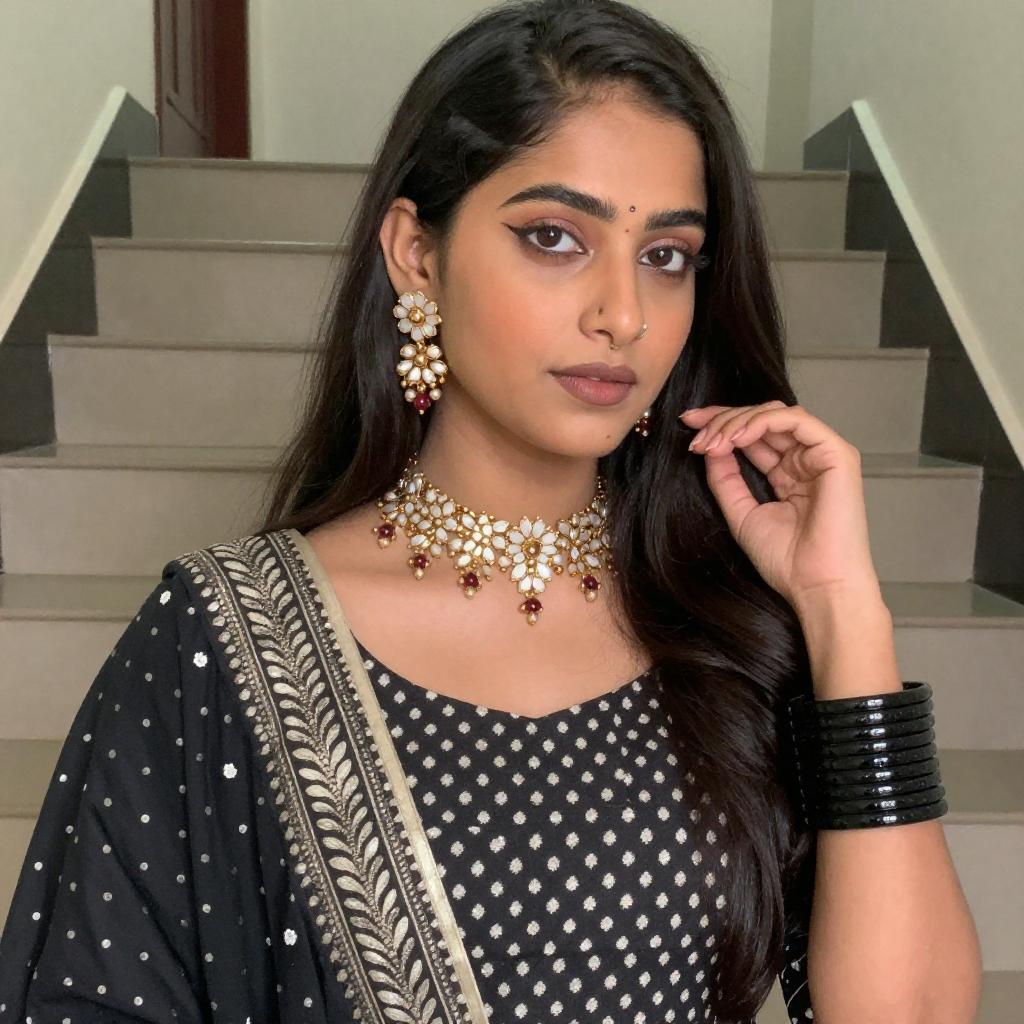 Woman with medium brown skin and dark hair in a ponytail, wearing a white dress with floral patterns, standing in a hallway. Background: tiled bathroom, hanging towel, closed door, small framed photos on a shelf. Smiling, casual pose.