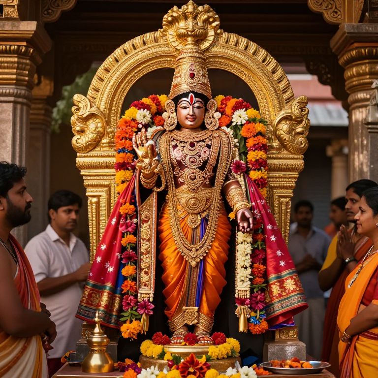 Venkateswara idol standing majestically in a richly decorated ancient temple with intricate gold jewelry, colorful silk robes, and radiant divine aura, surrounded by devotees offering flowers under soft golden sunlight, highly detailed and vibrant.