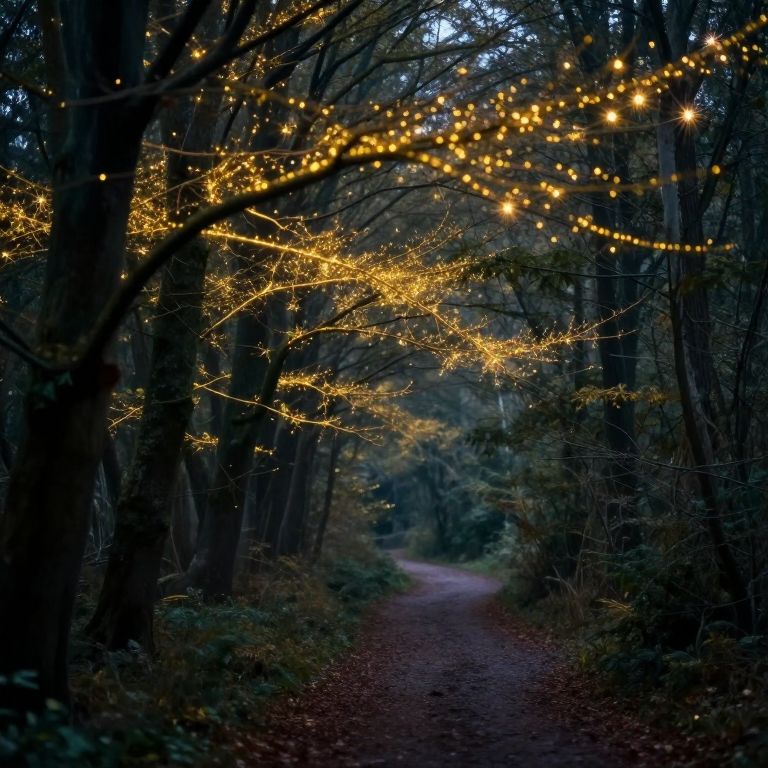 An ethereal forest whispers secrets of forgotten dreams, its bioluminescent branches casting golden sparks of memory along a path that invites introspection and the embrace of timeless mystery.