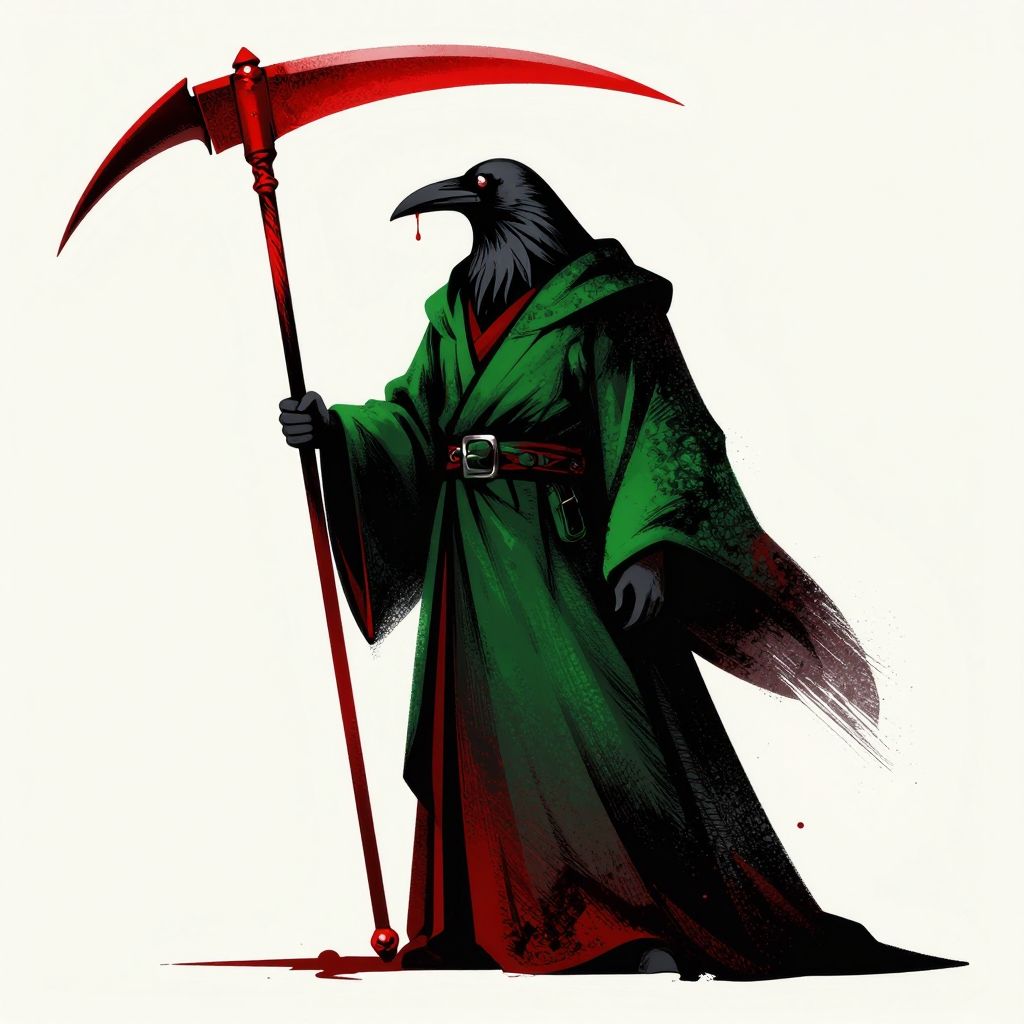 Digital illustration of a menacing black bird-headed figure in a green cloak, holding a large, red scythe, standing against a white background.