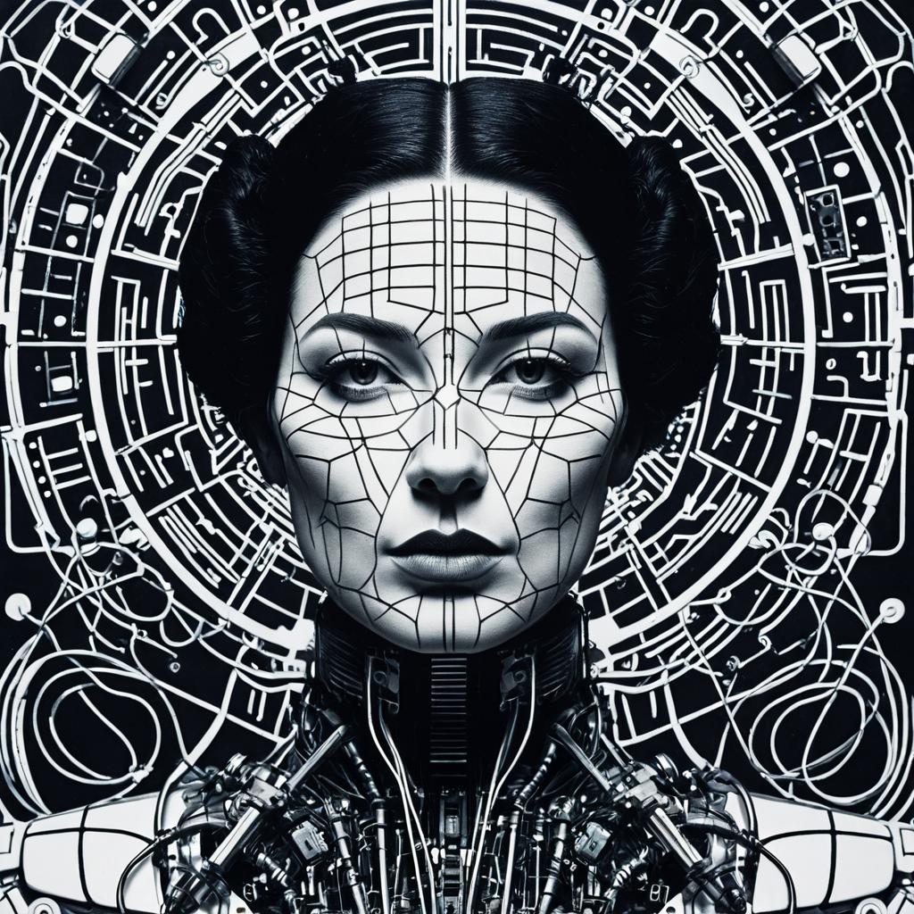 A mixed media portrait of a cybernetic biomechanical figure embodying non-binary beauty and futurism. The face integrates organic circuitry and geometric patterns, seamlessly blending human features with technological elements. The background features intricate circuit board designs and mechanical components, emphasizing the fusion of technology and artistry.