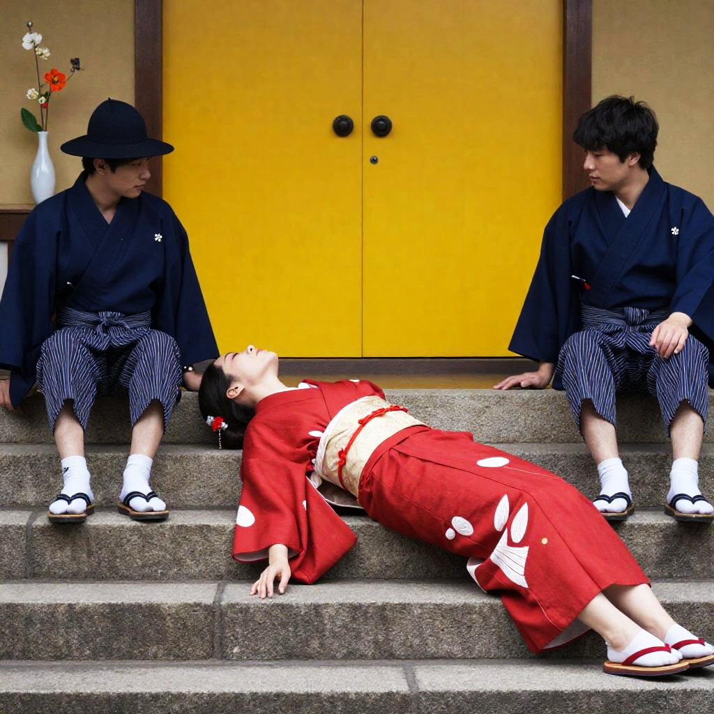Photograph of three people on stone steps. Woman in red kimono with white patterns lies on steps, head back. Two men in blue kimonos sit on either side, one in a hat. Yellow door and flower vase in background.