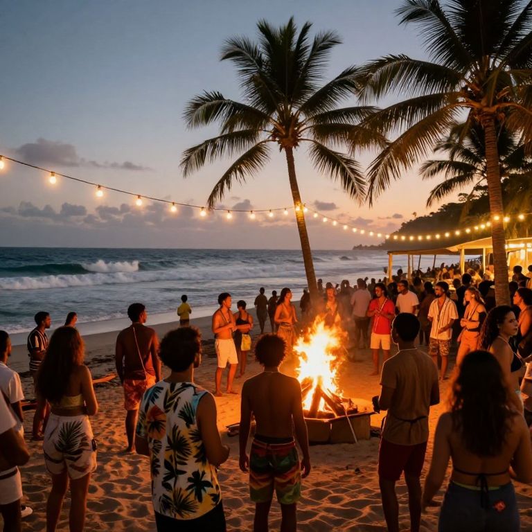 Reggae beach party at dusk with bonfire, crowd wearing casual tropical clothes, waves crashing near shore, vibrant string lights hanging from palm trees, relaxed and rhythmic mood, hyper-realistic style with warm tones.