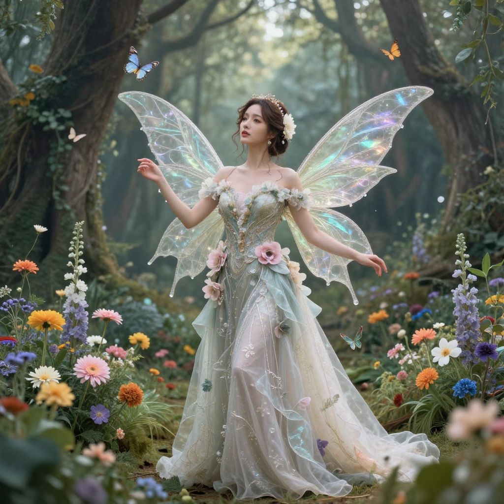 A graceful woman dressed as a magical fairy stands in an enchanted forest, surrounded by colorful flowers and fluttering butterflies. Her flowing gown is adorned with intricate floral details, and delicate translucent wings shimmer in the ethereal light filtering through the trees.