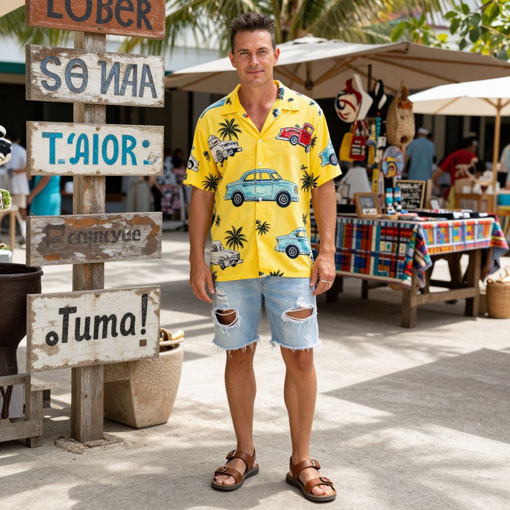 Photograph of a smiling, middle-aged man with short brown hair and light beard, standing in the center of a cobblestone street in a quaint village. He wears a light blue, short-sleeved Hawaiian shirt with green palm tree patterns, beige cargo shorts, and gray slip-on shoes. The background features stone buildings with red-tiled roofs, hanging flower baskets with vibrant red, yellow, and white flowers, and potted plants lining the street. The sky is bright and clear, suggesting a sunny day. The man's stance is relaxed, with his hands by his sides.