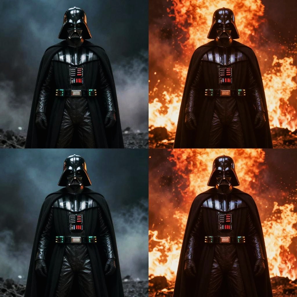 Pixel art of Darth Vader in four quadrants: blue-lit, dark, fiery explosion, and sunset; each quadrant showcasing different lighting and background.