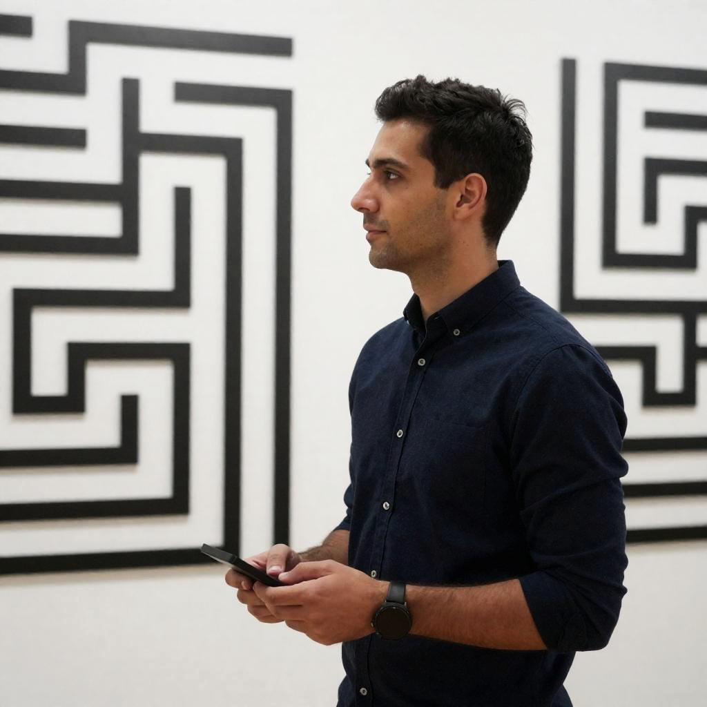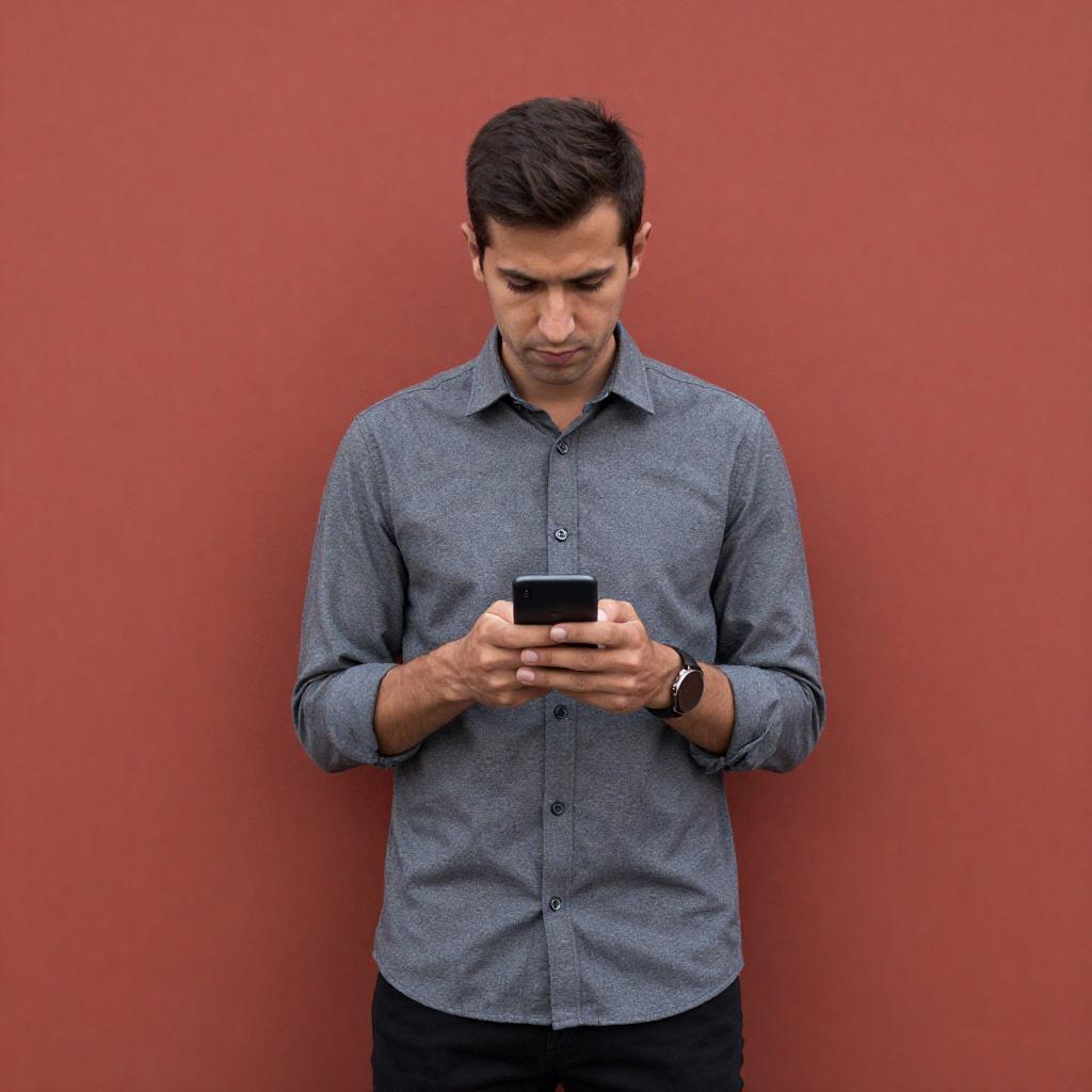 Man with short dark hair, wearing a gray button-up shirt and black pants, stands against a red wall, looking at a smartphone with a focused expression. He holds the phone with both hands, slightly leaning forward. Red wall in the background.