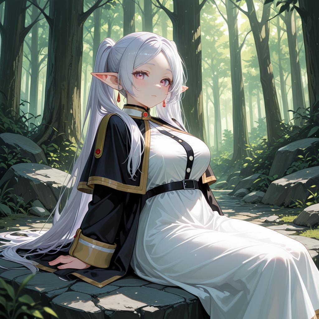 Digital artwork of a young fantasy elf girl with long white hair styled in twin ponytails, pointed ears, and green eyes. She is wearing a white sleeveless dress with a green ribbon and decorative embroidery, sitting gracefully in a forest setting illuminated by soft glowing lights and bokeh effects. The image features detailed skin texture, expressive eyes, and vibrant lighting, capturing a magical and serene atmosphere.