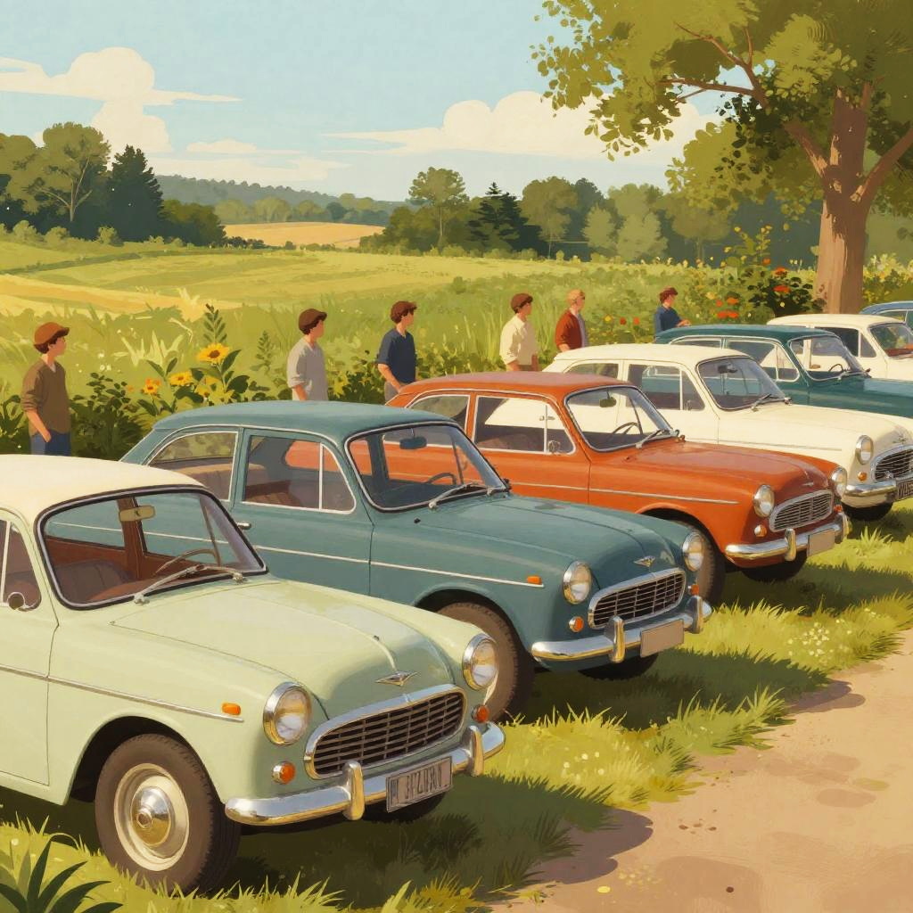 Vintage style illustration of truenos gathering at a countryside car meet, classic design elements blended with modern tweaks, warm afternoon lighting, lush green fields in the background, nostalgic yet contemporary vibe with painterly textures
