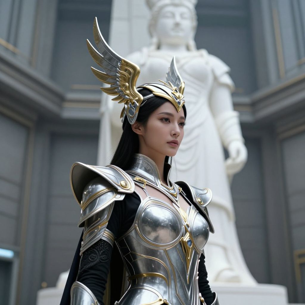 In this image, a woman stands in a futuristic, advanced civilization setting, adorned in intricate, metallic armor that blends elements of ancient and futuristic design. Her headpiece is a striking combination of gold and silver, featuring elaborate wings and intricate detailing, reminiscent of a goddess or a high-ranking figure. The armor she wears is a mix of silver and black, with a high collar and shoulder guards that add to the regal and powerful appearance. In the background, a large, ancient statue of a warrior or deity stands tall, its form made of a smooth, white material that contrasts with the woman's armor. The scene is set in a spacious, industrial-like environment with concrete structures, suggesting a blend of ancient and modern elements. The lighting is soft, casting gentle shadows that highlight the textures and details of the armor and the statue. The overall composition is balanced, with the woman positioned in the foreground, the statue slightly behind her, and the industrial background providing a sense of depth and scale. The image evokes a sense of magic and technology, blending the ancient and the advanced in a visually striking manner.
