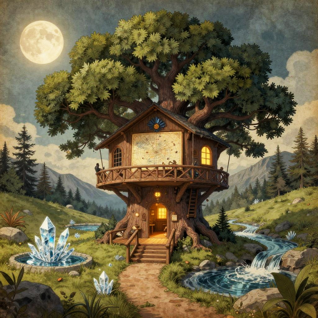 Anton Pieck style illustration of a celestial cartographer's observatory and star-map atelier built into a sprawling yew tree, large continuous tree, leafy roof, inviting entrance with bridge, connected paths, in a alpine moonlit glade with crystalline ponds, flowing stream, waterfall, vintage paper texture, intricate line work, high detail, mystical atmosphere, warm and nostalgic tones, soft lighting, high quality, warm window lighting