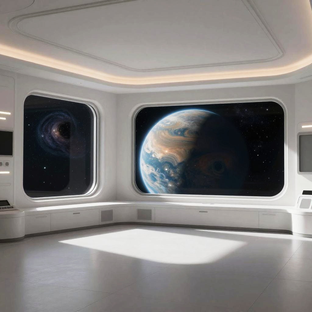 Neutrali concept art of a tranquil space station orbiting a distant planet, clean white and gray interiors with large windows overlooking stars and swirling nebulas, calm and meditative atmosphere with subtle sci-fi details and soft glowing panels