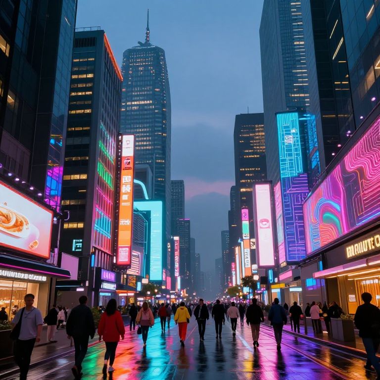 A vibrant urban cityscape at dusk featuring tall modern buildings illuminated by luminous holographic and neon signs in shifting colors. Wet streets reflect the colorful lights, with a bustling crowd dressed in diverse colorful attire walking along the street. The scene showcases a cyberpunk aesthetic with vivid light effects and detailed architectural elements.